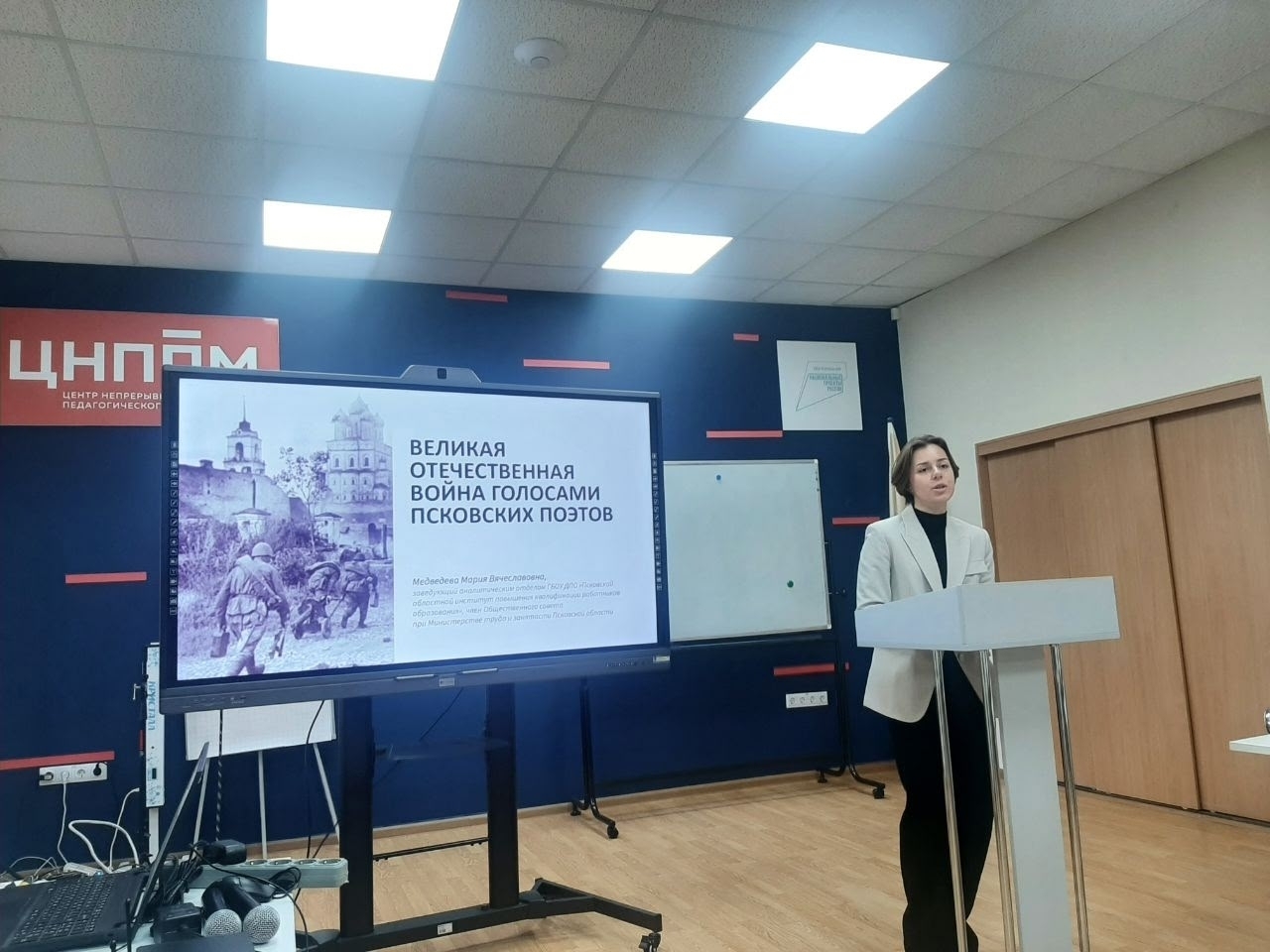 В год 80-летия со дня Великой Победы заведующий аналитическим отделом ПОИПКРО Мария Медведева провела лекцию «Великая Отечественная война голосами псковских поэтов».